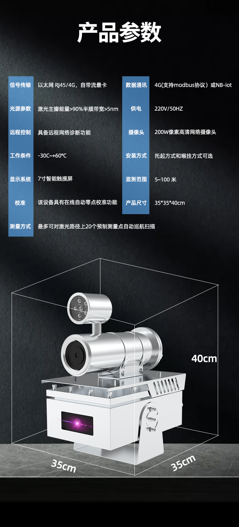 奕帆可視化顆粒物濃度在線監(jiān)測(cè)儀是我司專門針對(duì)大氣顆粒物 TSP 濃度的監(jiān)測(cè)研發(fā)的一款智能型“圖像視覺(jué)”傳感器檢測(cè)系統(tǒng),由顆粒物TSP在線監(jiān)測(cè)儀、預(yù)處理系統(tǒng)、數(shù)據(jù)采集、傳輸系統(tǒng)、后臺(tái)數(shù)據(jù)處理系統(tǒng)及信息監(jiān)控管理平臺(tái)共四部分組成??蓪?shí)時(shí)對(duì)空氣中顆粒物濃度(TSP)、噪聲、溫度、濕度、風(fēng)速、風(fēng)向進(jìn)行在線監(jiān)測(cè),該系統(tǒng)還可與各種污染治理裝置霧炮、塔吊噴水系統(tǒng)、圍墻噴淋等聯(lián)動(dòng),以達(dá)到自動(dòng)降塵控制的目的。 可視化 TSP 監(jiān)測(cè)儀采用高靈敏的進(jìn)口組件,整合多個(gè)行業(yè)中的光機(jī)電一體化技術(shù),采用有精密跟蹤功能的紅外激光照明器,配合各種規(guī)格的長(zhǎng)焦距的高性能攝像機(jī),實(shí)現(xiàn)環(huán)境顆粒物濃度檢測(cè)。 使用場(chǎng)合