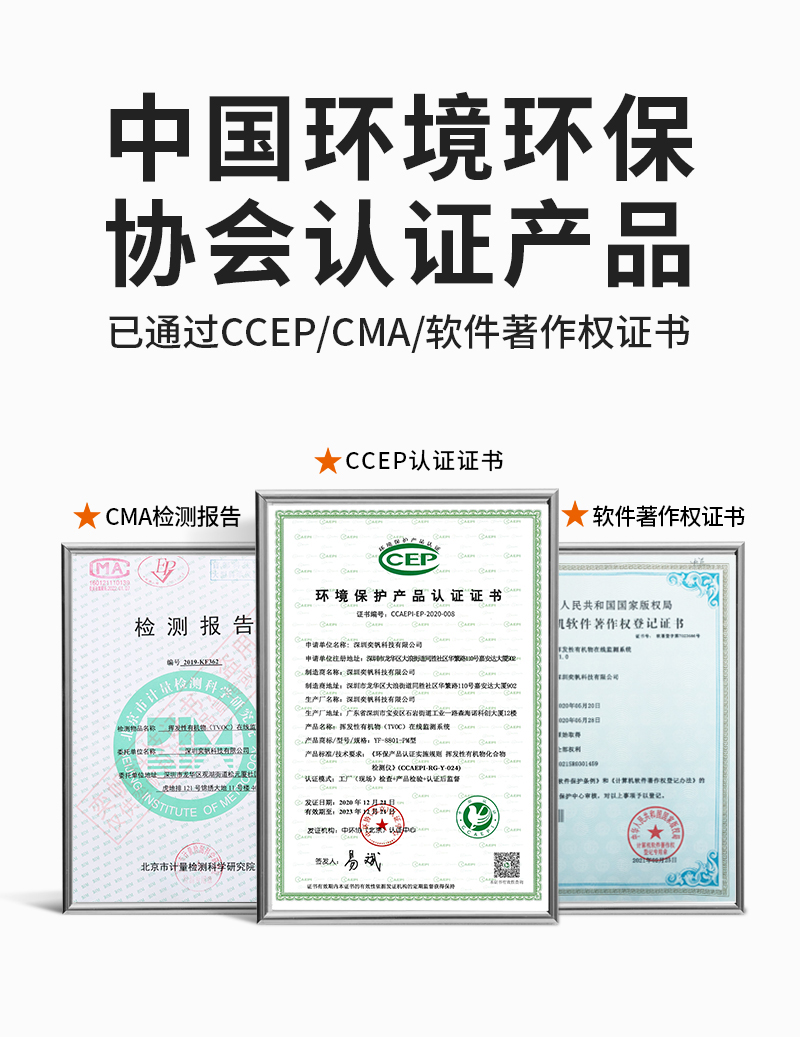 產(chǎn)品資質(zhì)齊全,有CCEP環(huán)保協(xié)會認證、有計量院CMA檢測報告 -